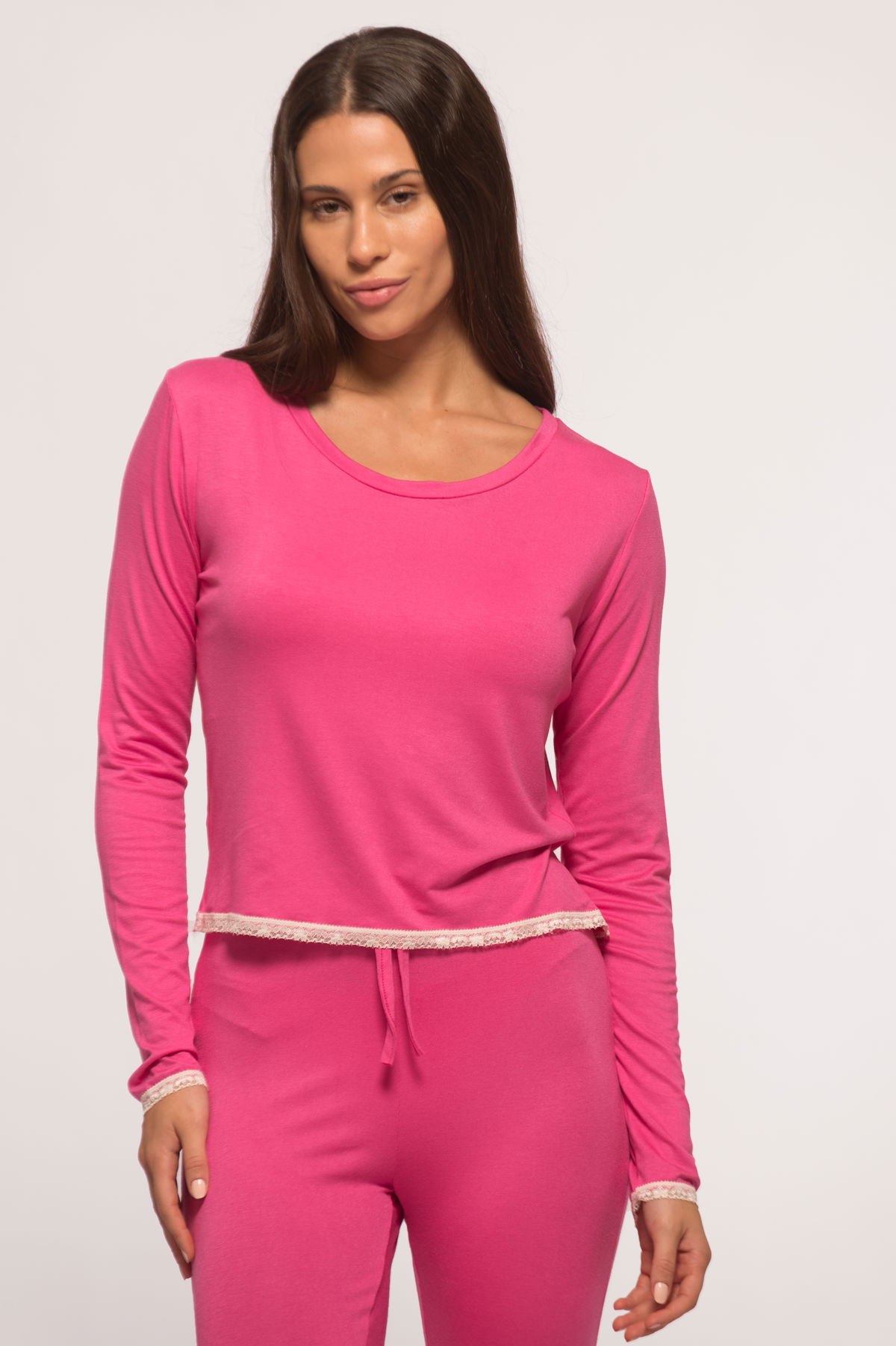 Conjunto de pantalón tipo calzita y camiseta manga larga, ambas prendas con terminación de puntilla 💕 . Confeccionadas en modalidad viscosa, una tela súper cómoda liviana y suave, que no genera pelotitas con el roce !